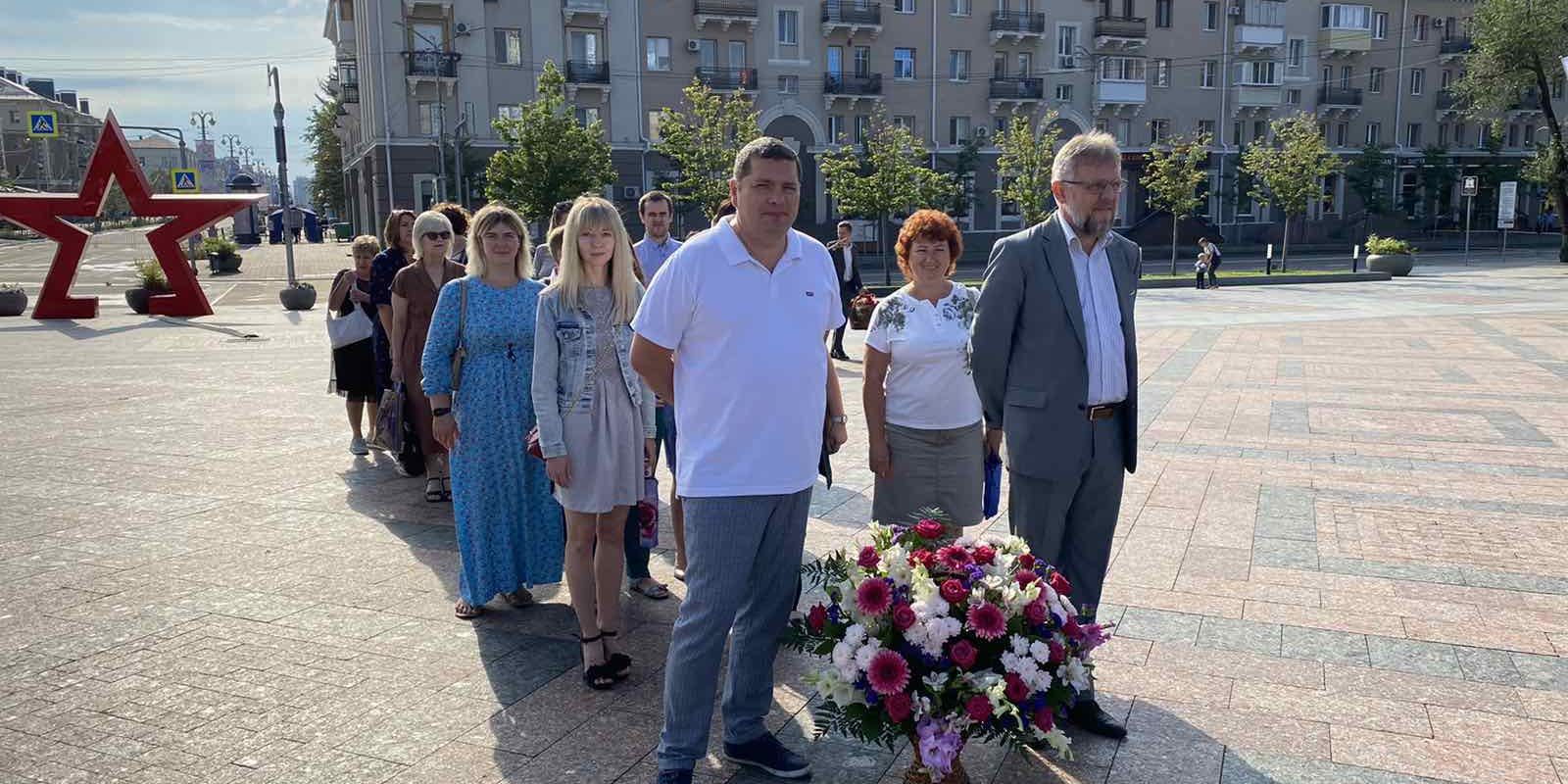 Коллектив управления образования и подведомственных учреждений почтили память советских солдат у памятника-стелы «Город воинской славы», возложив цветы к Вечному огню в Белгороде.