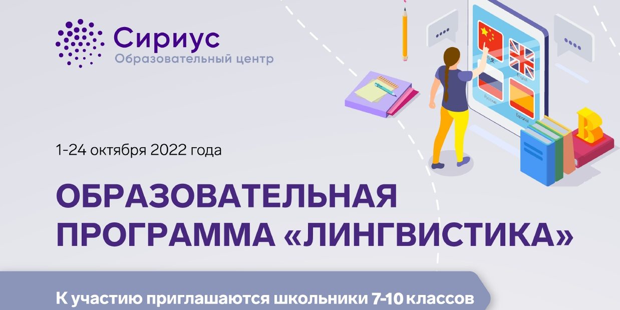 С 1 по 24 октября 2022 года на базе ОЦ «Сириус» пройдет образовательная программа «Лингвистика» для обучающихся 7-10 классов.