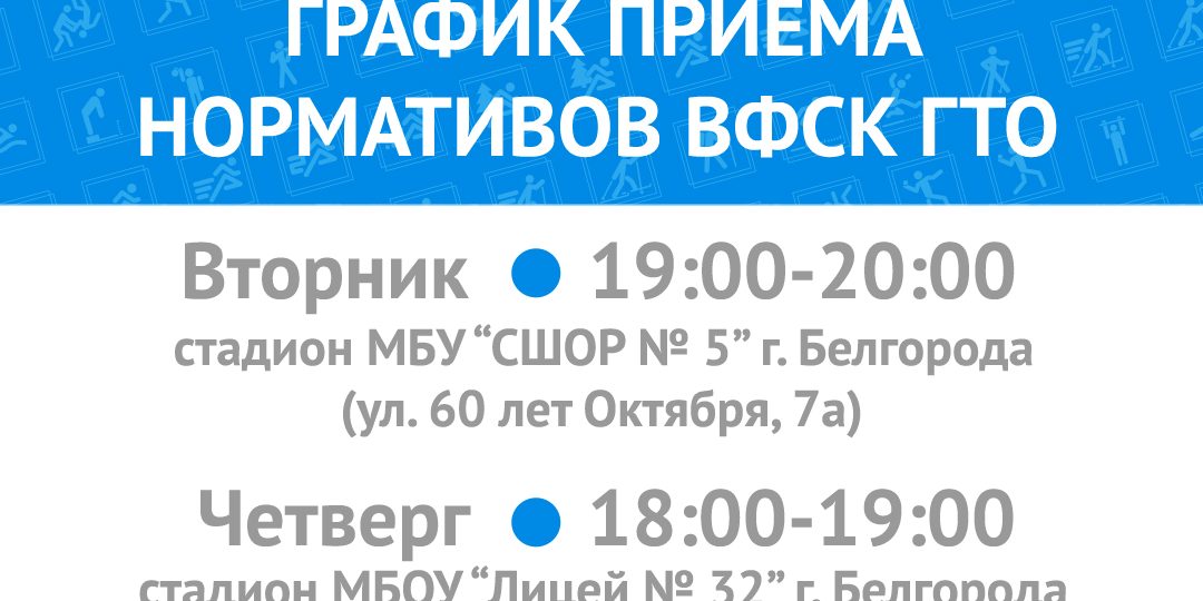 - еженедельно по четвергам с 18:00 до 19:00 ч. на стадионе МБОУ «Лицей № 32» г. Белгорода (бег на длинную дистанцию и силовые нормативы).